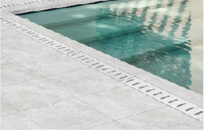 • Porcelain deck + simple stone or concrete coping as a clean border